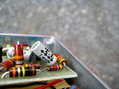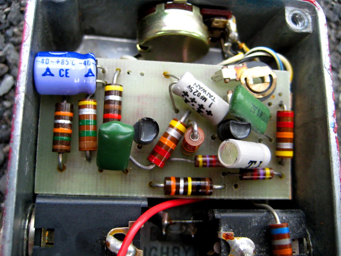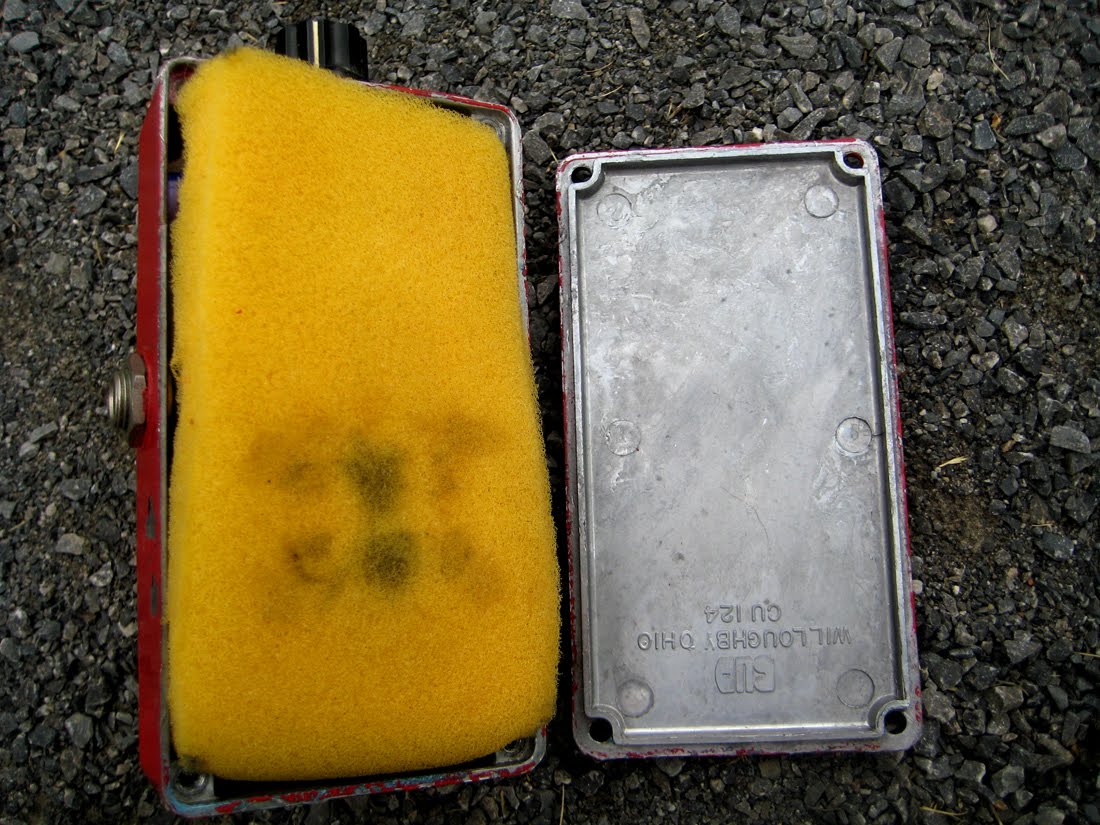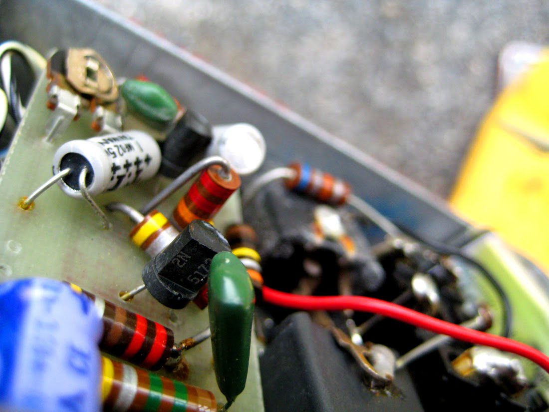 Last June a seemingly homemade pedal came up for auction on ebay. The seller had no idea of its origin or even what it sounded like, since he couldn't get it to work. I did not recognize the circuit but could tell it was old and that it was possibly a fuzz. I figured "what the hell?" and went for it. Worst case scenario, it was something like a home-project Fuzz Face that I could raid for parts; best case, it was some rare and previously unknown circuit I could nab for a really low price and easily fix.
